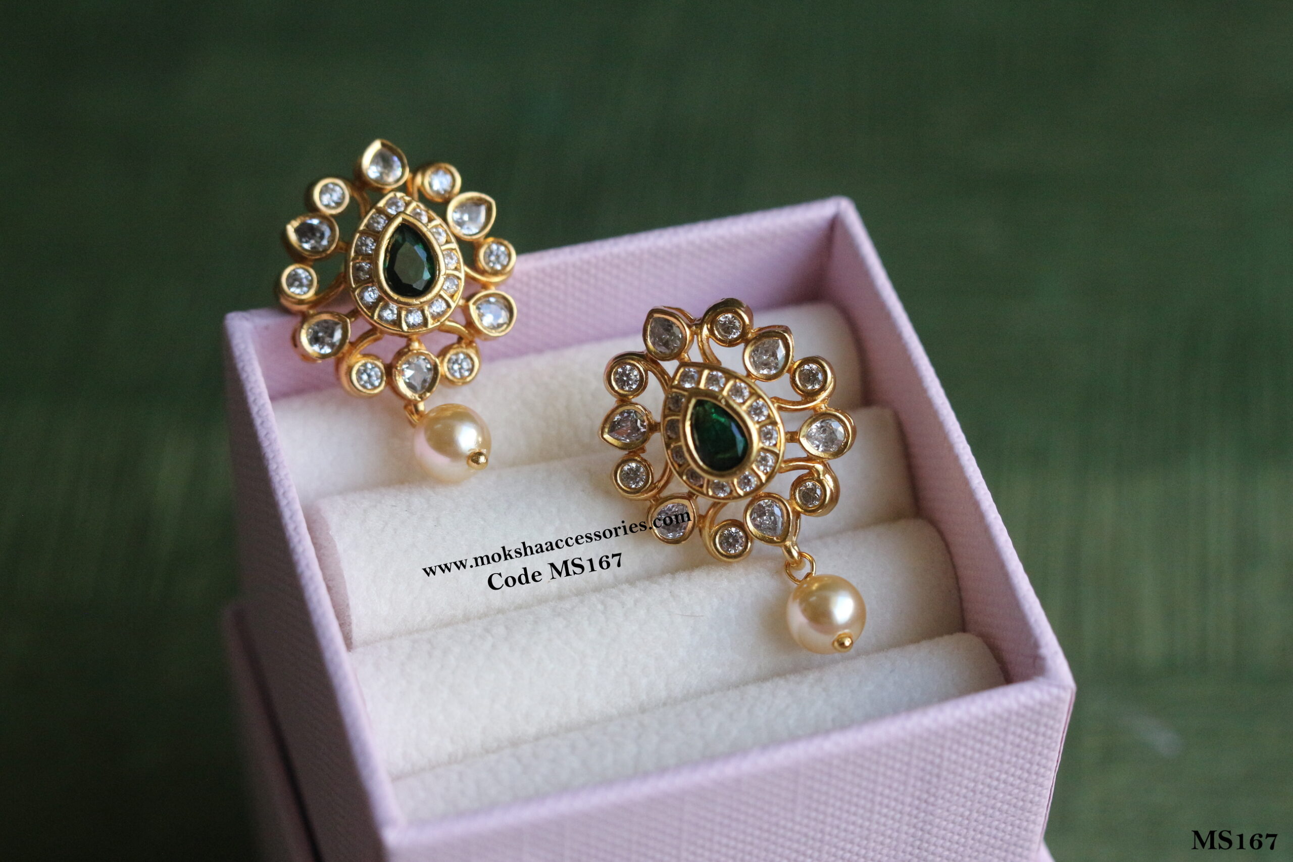 92.5 silver cz and emerald stone studs with pearl drops (8.8 gms) quantity