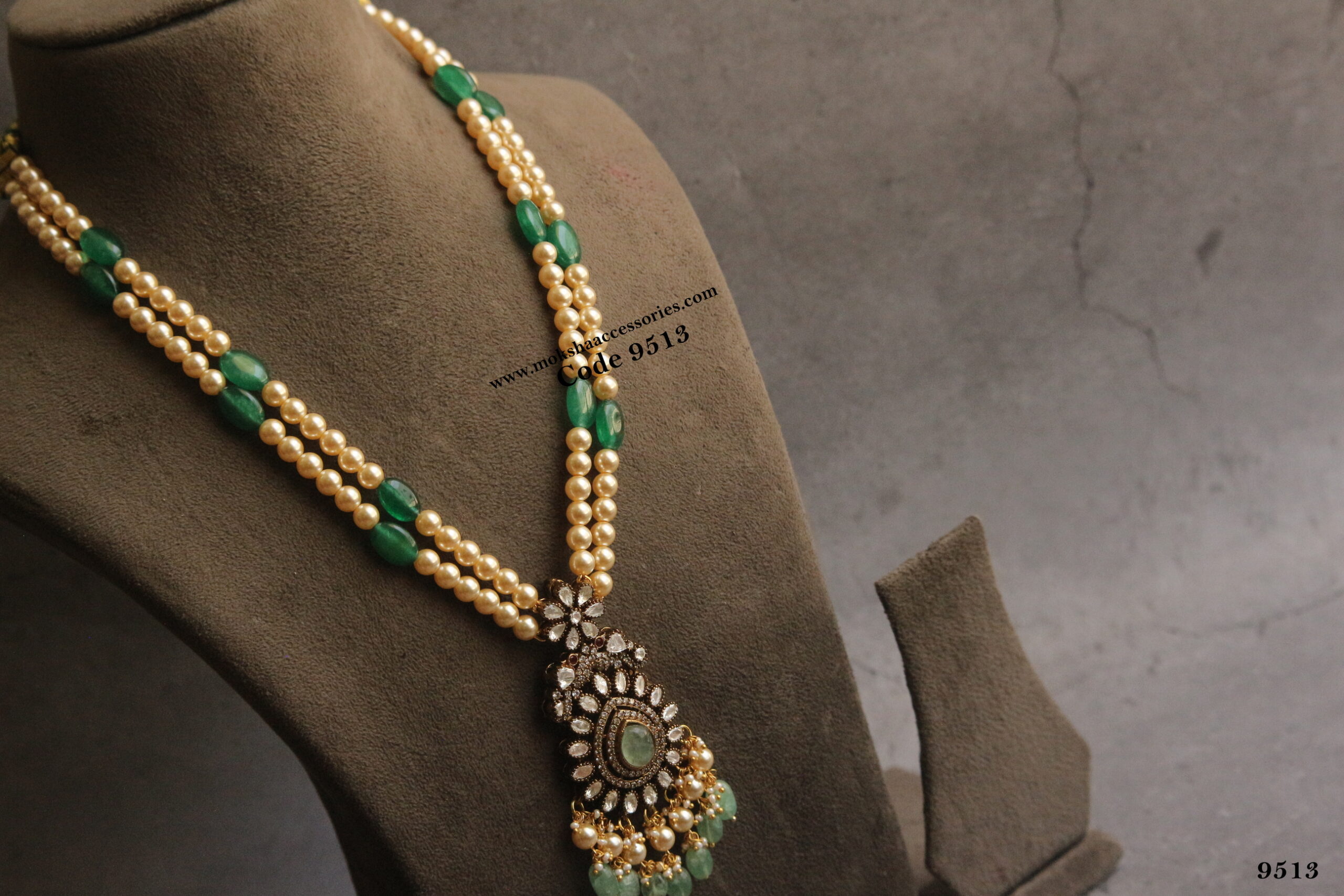 Mozonite stone pendant with sarvoski pearl mala